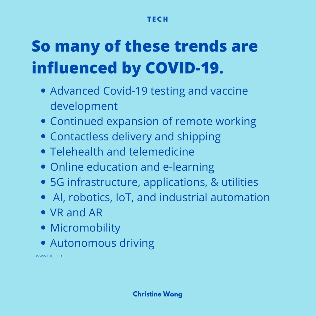 I think the top tech trends of 2021 are really interesting to look at because a lot is actually driven by the pandemic. One thing to note is most people think of high tech but don’t actually see things like advanced covid development as “tech.” Many companies develop technology behind the scenes to operate more efficiently and effectively. Even animation studios develop in-house technology to animate better hair on characters!